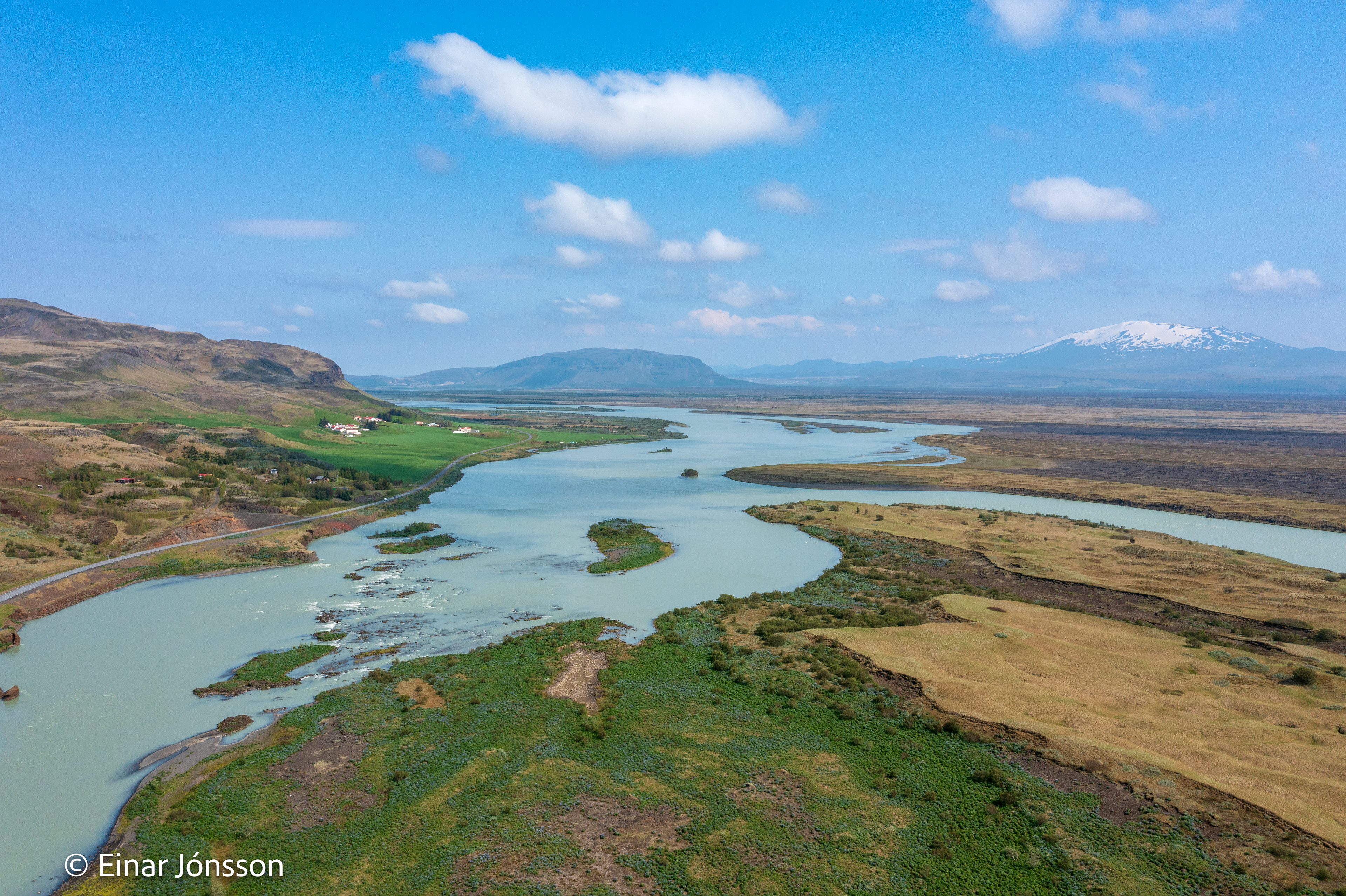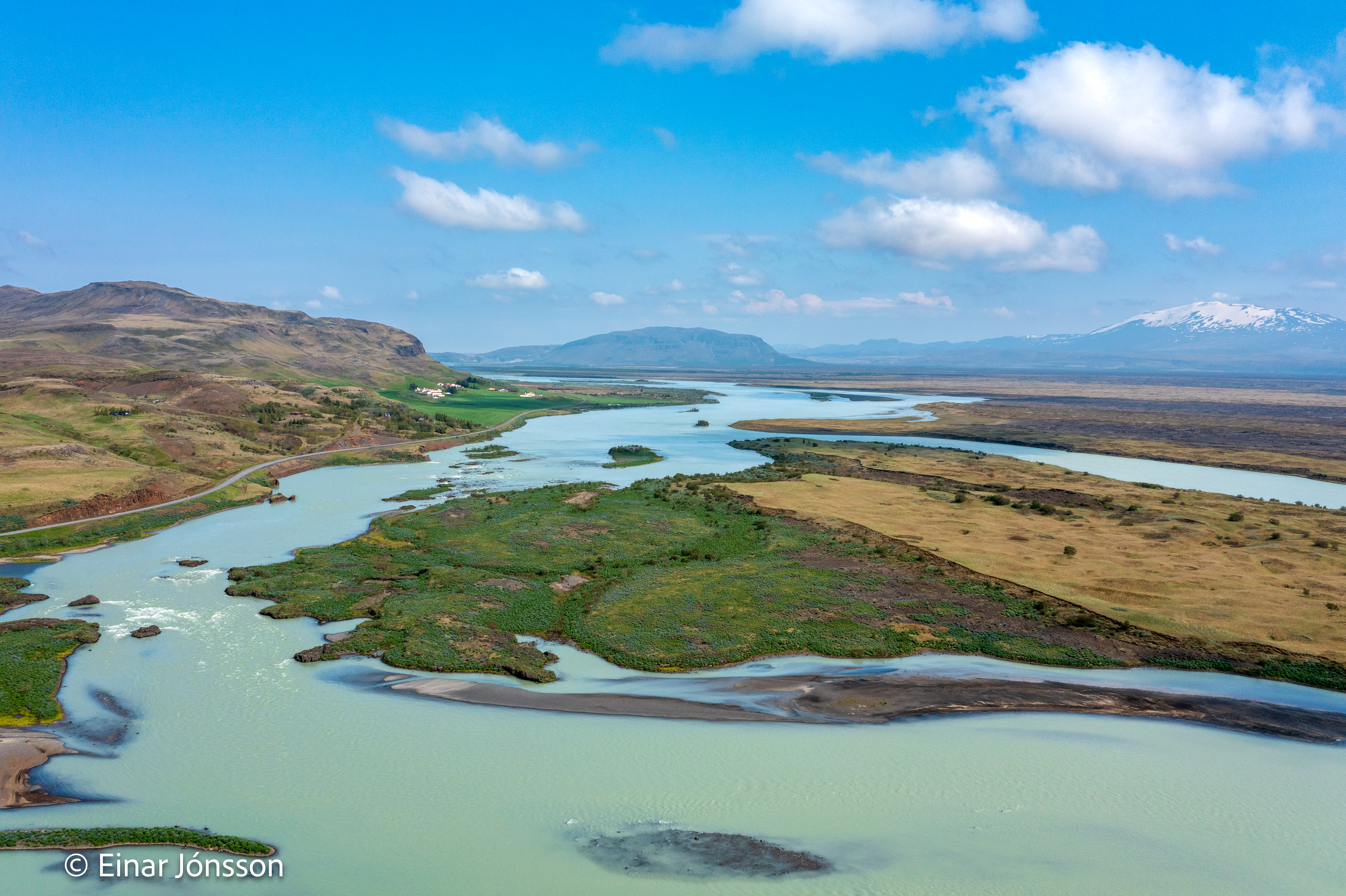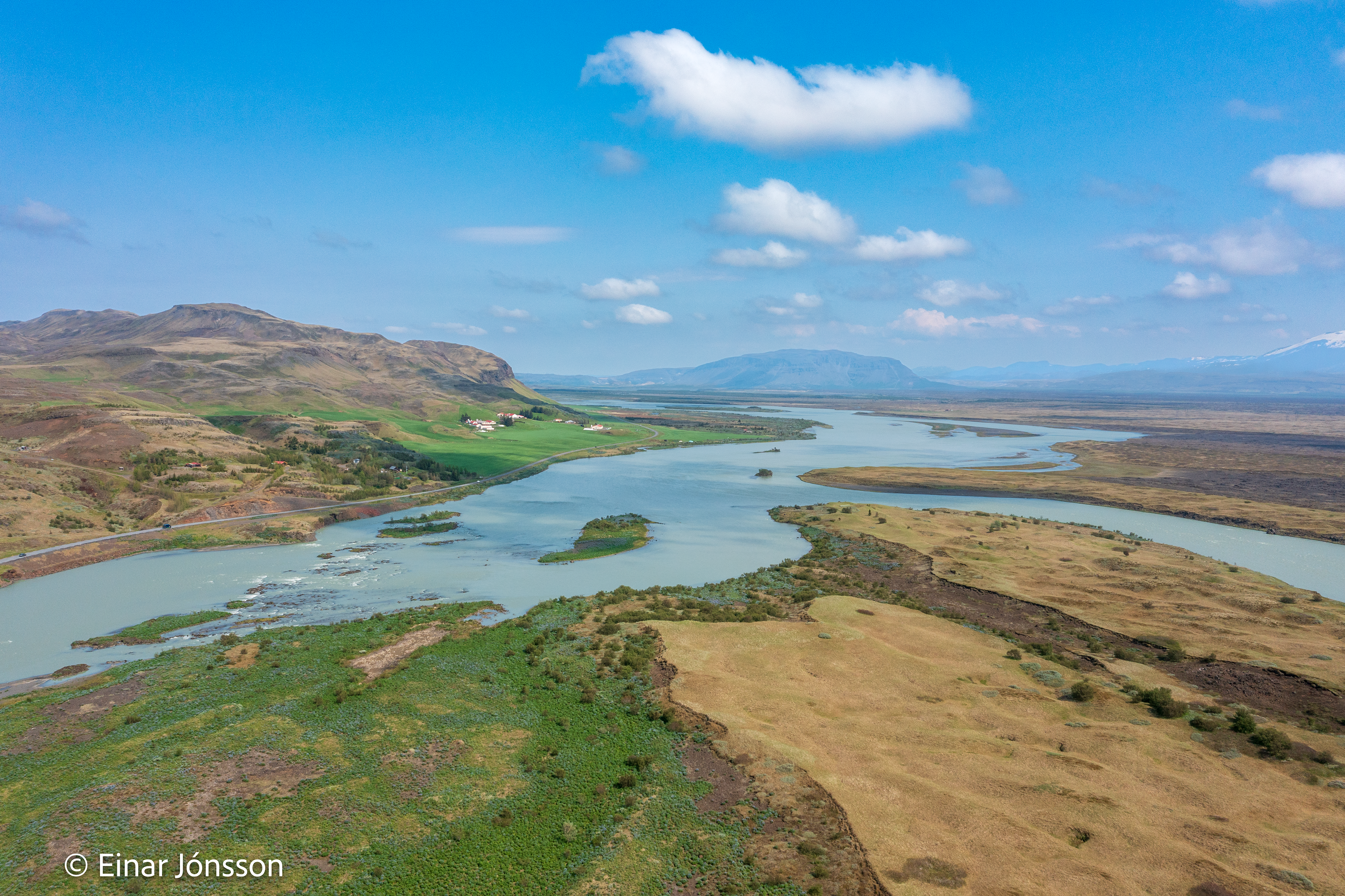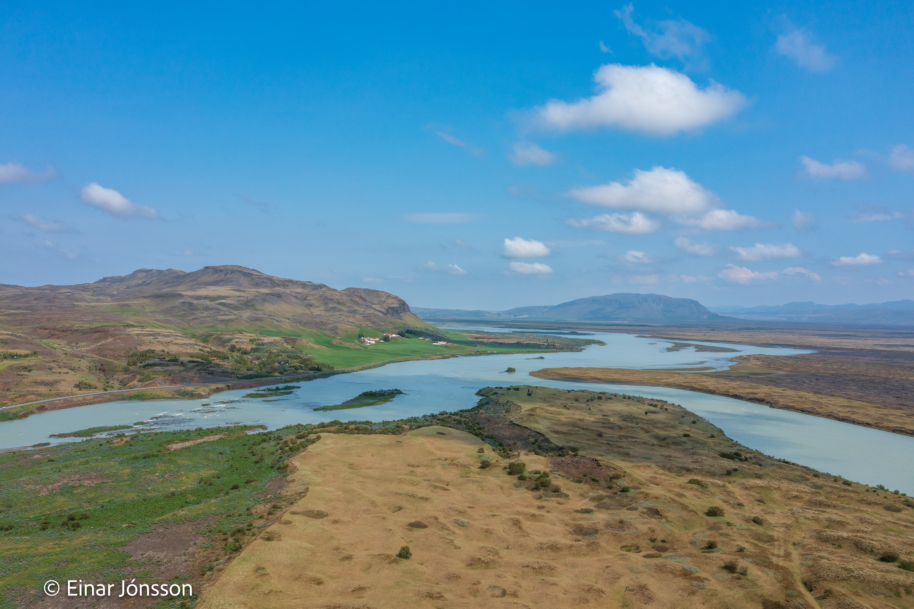 Drónamynd af Þjórsá við Haga tekin 17. júní 2023. Hagey fyrir miðri mynd.