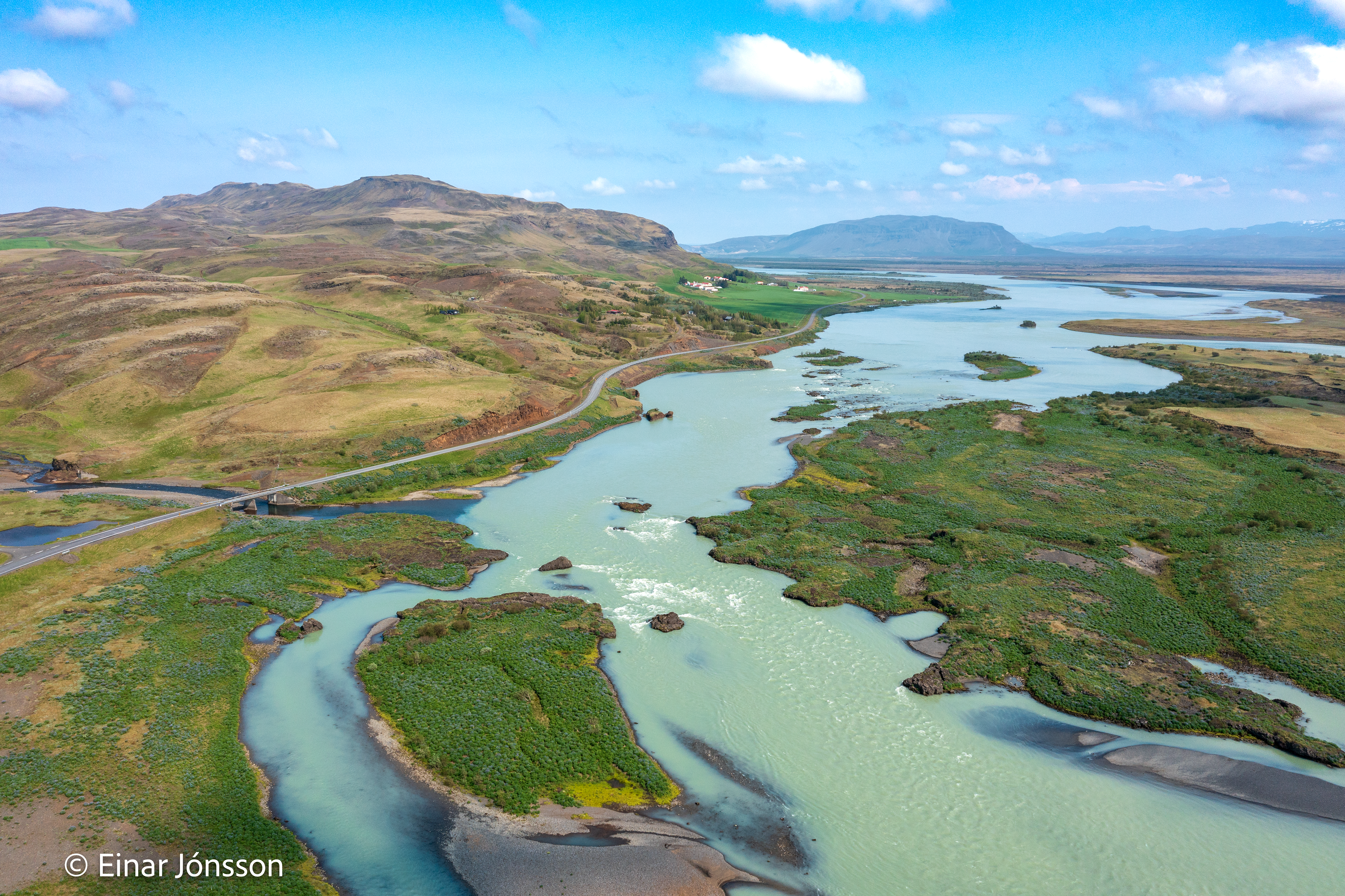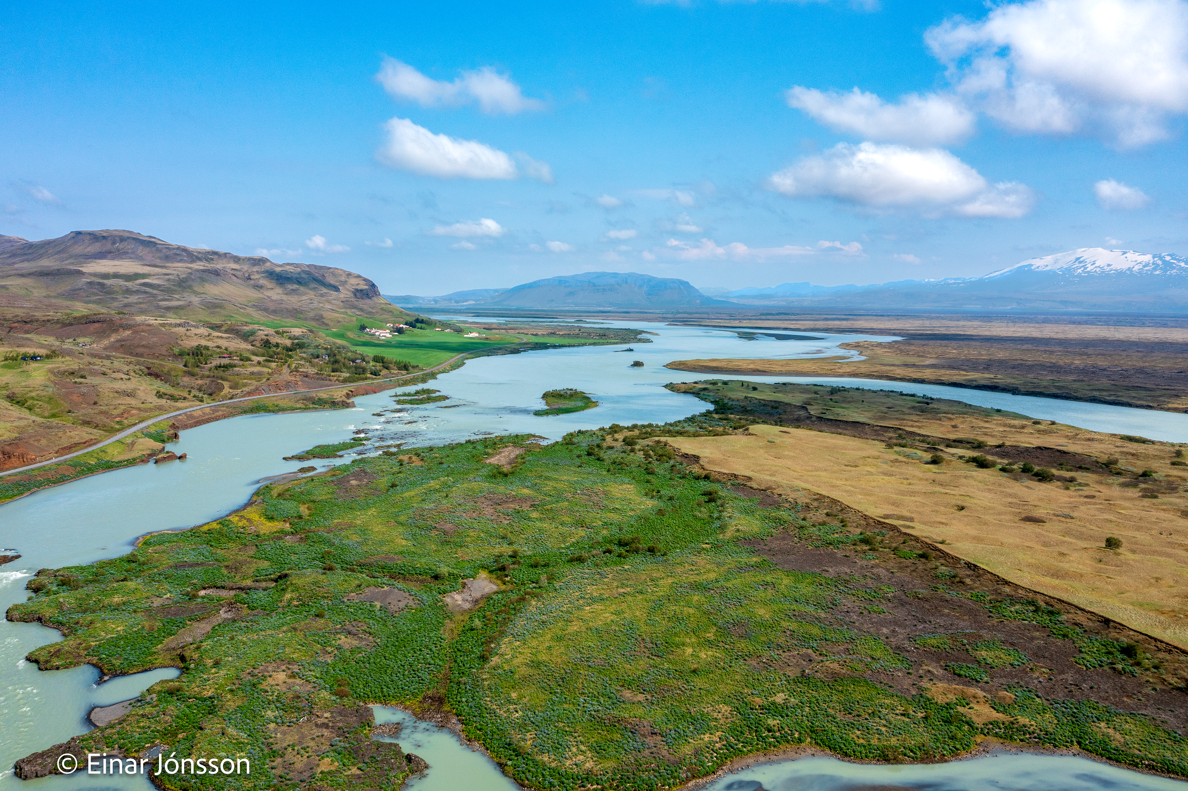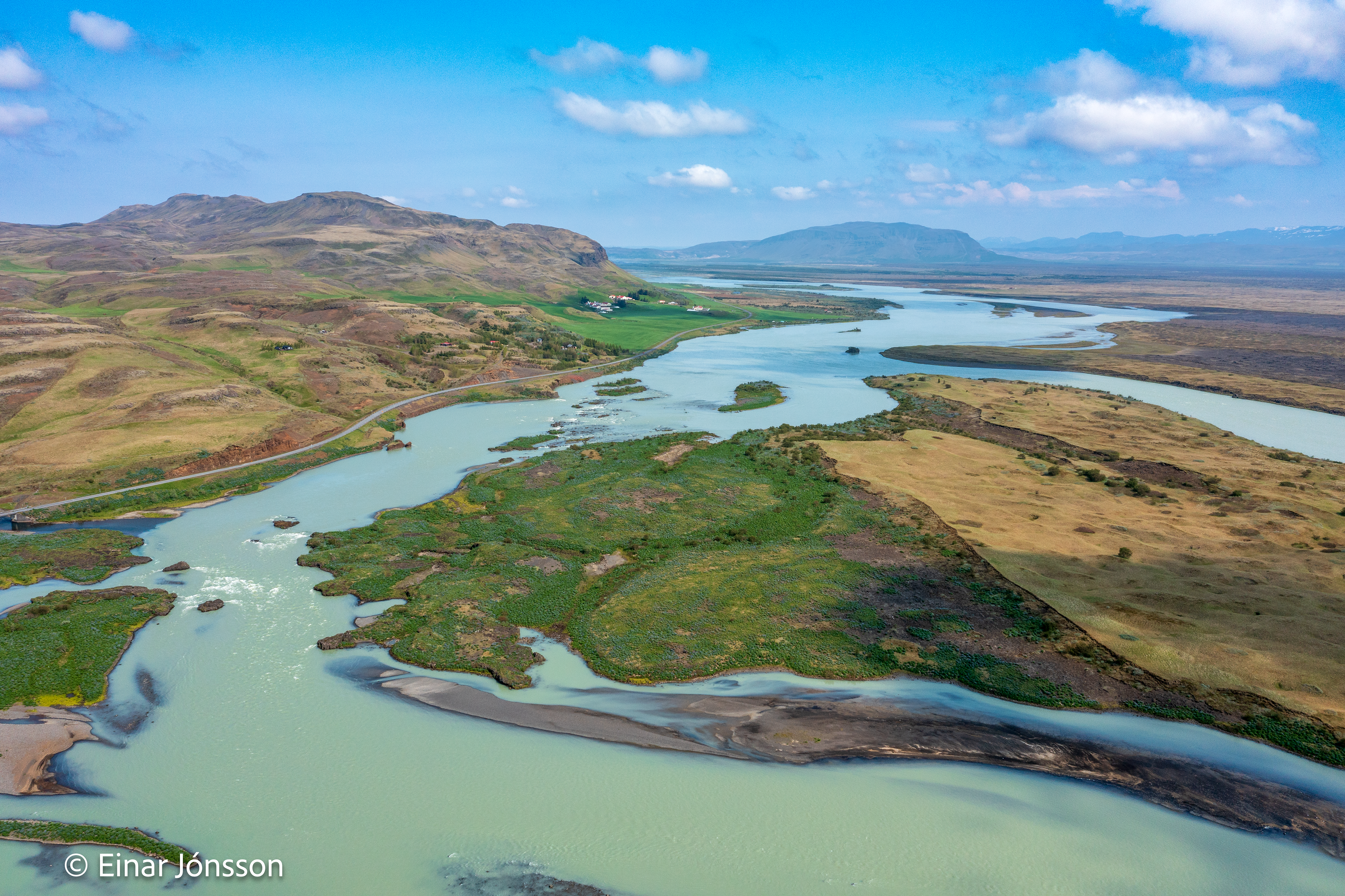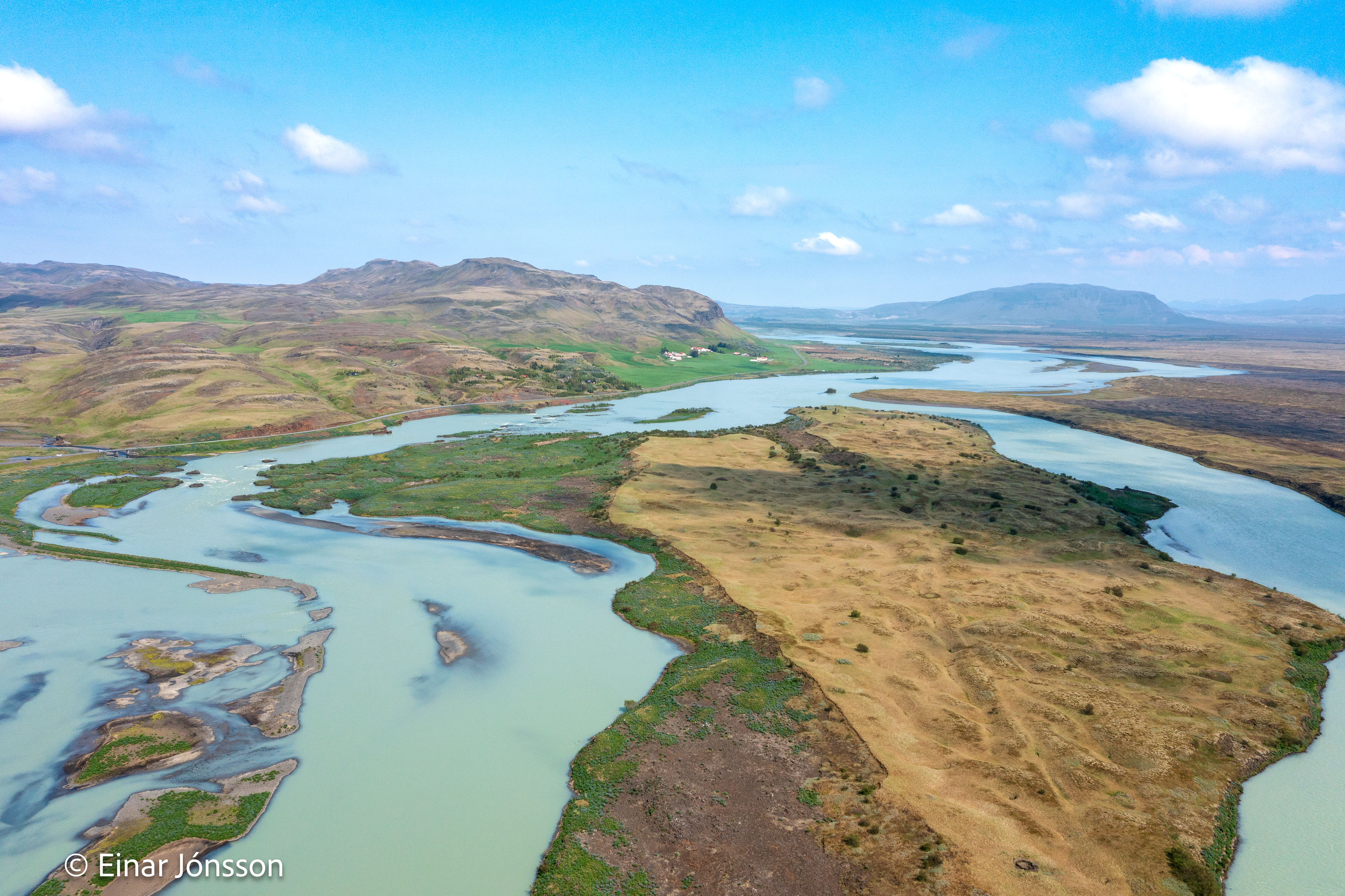 Drónamynd af Þjórsá við Haga tekin 17. júní 2023. Hagey fyrir miðri mynd.