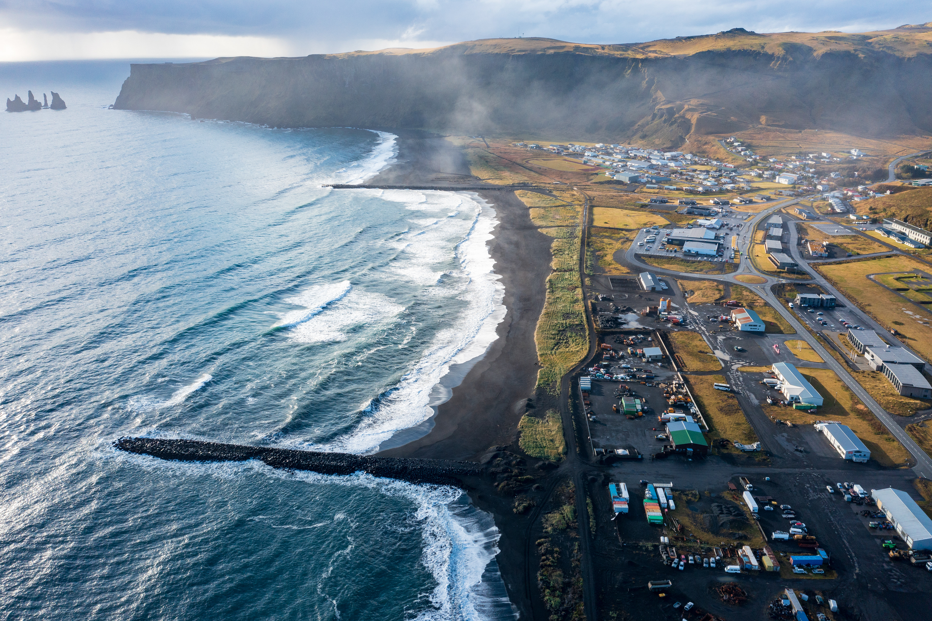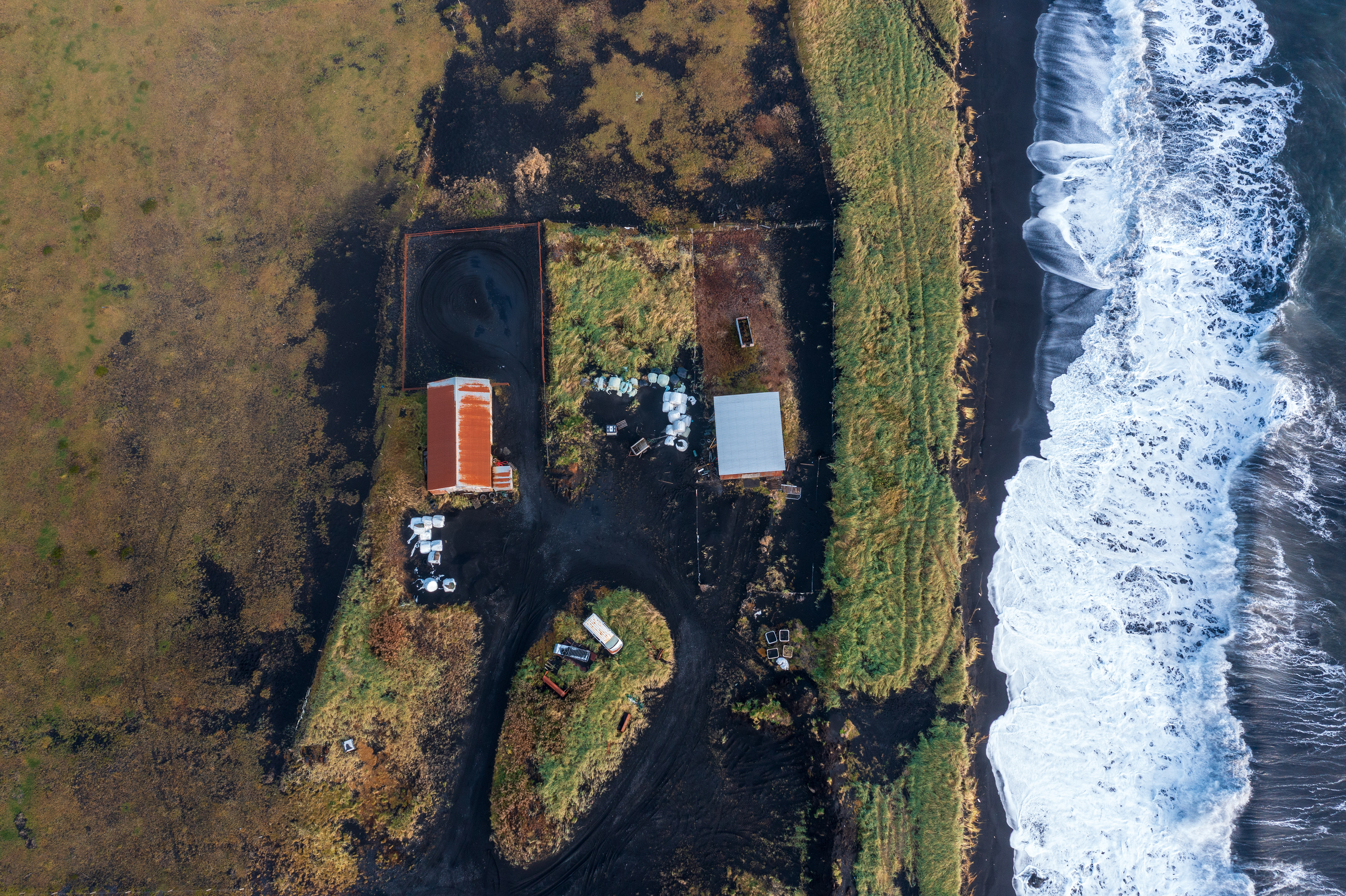 Drónamyndir teknar í Vík í Mýrdal 9. október 2022 og m.a. má sjá þorpið í Vík og varnir gegn landbroti (sandfangara). Myndirnar sýna nálægð hafsins við byggðina. Þann 26. ágúst 2025 skolaði fjárhúsi, sem sjá má á neðri myndinni, á haf út.